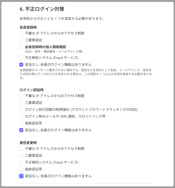 会員機能がある場合は、各項目で実施している対策を1つ以上選びます。