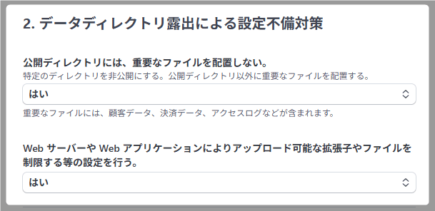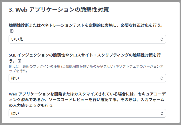 Shopifyなどのプラットフォーム利用者や、WordPress本体、プラグイン、テーマを常に最新版にアップデートしている方は、対策を行っていると見なせますので、両方とも「はい」と回答しましょう。