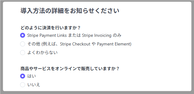 ここでは、あなたがStripeをどのように使っているかを聞かれています。